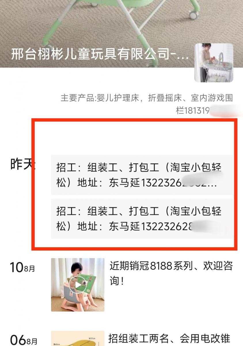 [工作职位] 邢台栩彬儿童玩具有限公司--贝悦琪招工:组装工、打包工(淘宝小包轻松)地址:东马延(临时工勿扰)  诚邀来电,请说明是在 邢台家园网 上看到的,欢迎您分享!