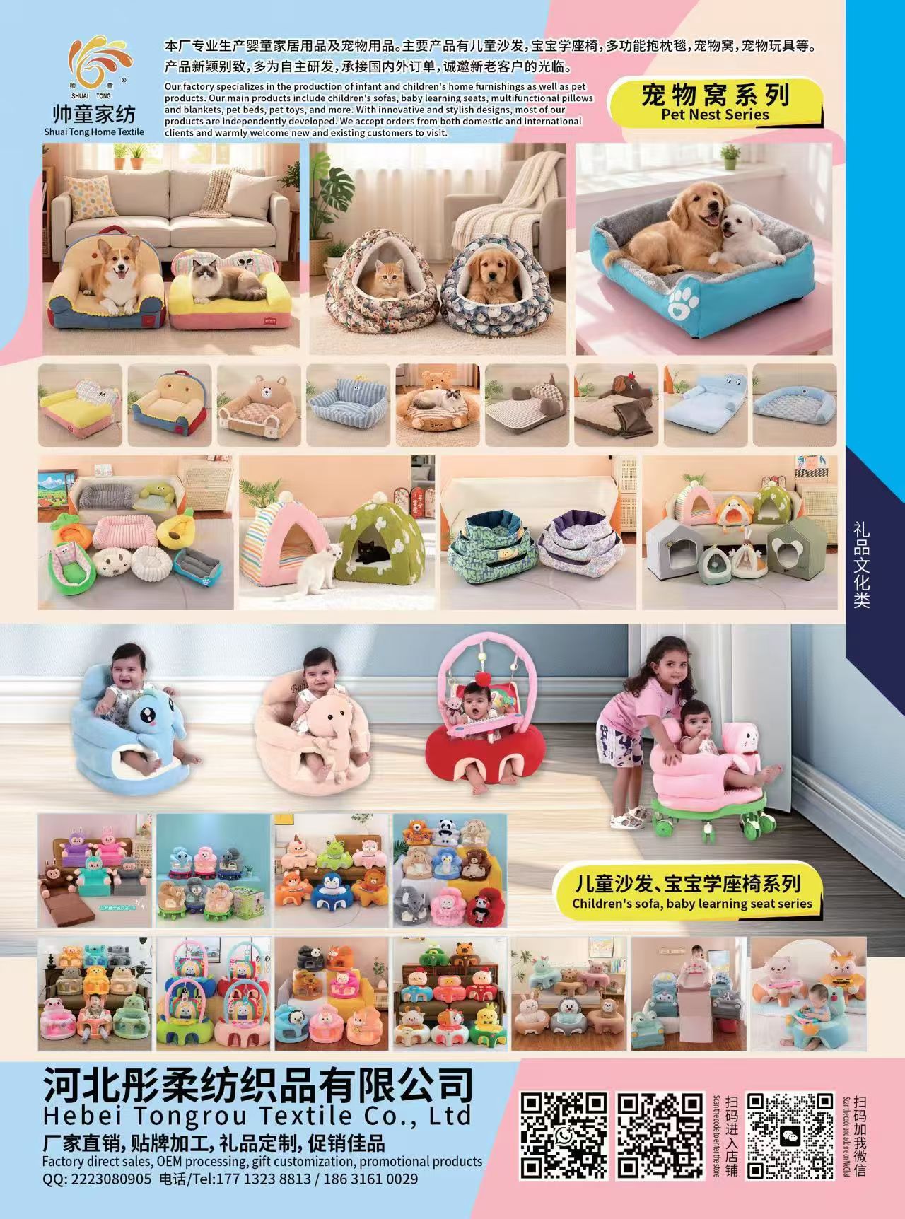 [ 婴童智能 ] - 河北彤柔纺织品有限公司-滑行学步车-沙发,本公司为专业生产婴童家纺家居产品,电话微信: 17713238813 .... 17713238823 ... 18631610029 ....我们主要产品有儿童沙发,宝宝学座椅,沙发滑车及各种空调被抱枕毯等,生产基地位于河北雄安新区工业园,江苏叠石桥及义乌商贸城设有发货库房,主要承接国内批发商和外贸定单,